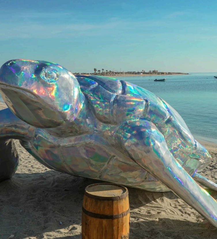 large chrome turtle sculpture, complemented by a