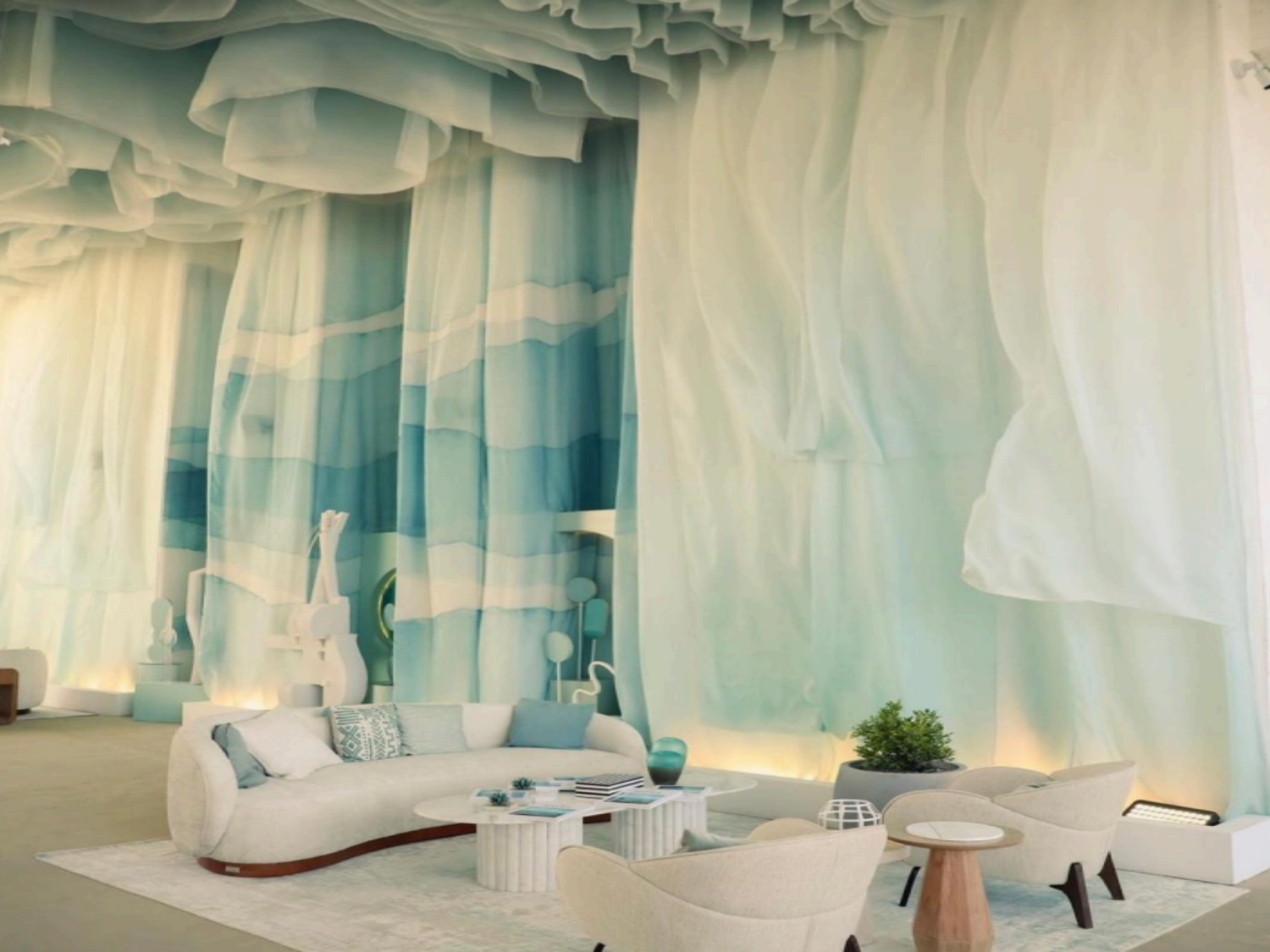 with intricate cloud like forms. Soft pastel hues and light-shadow interplay add depth, inviting visitors to a serene space.