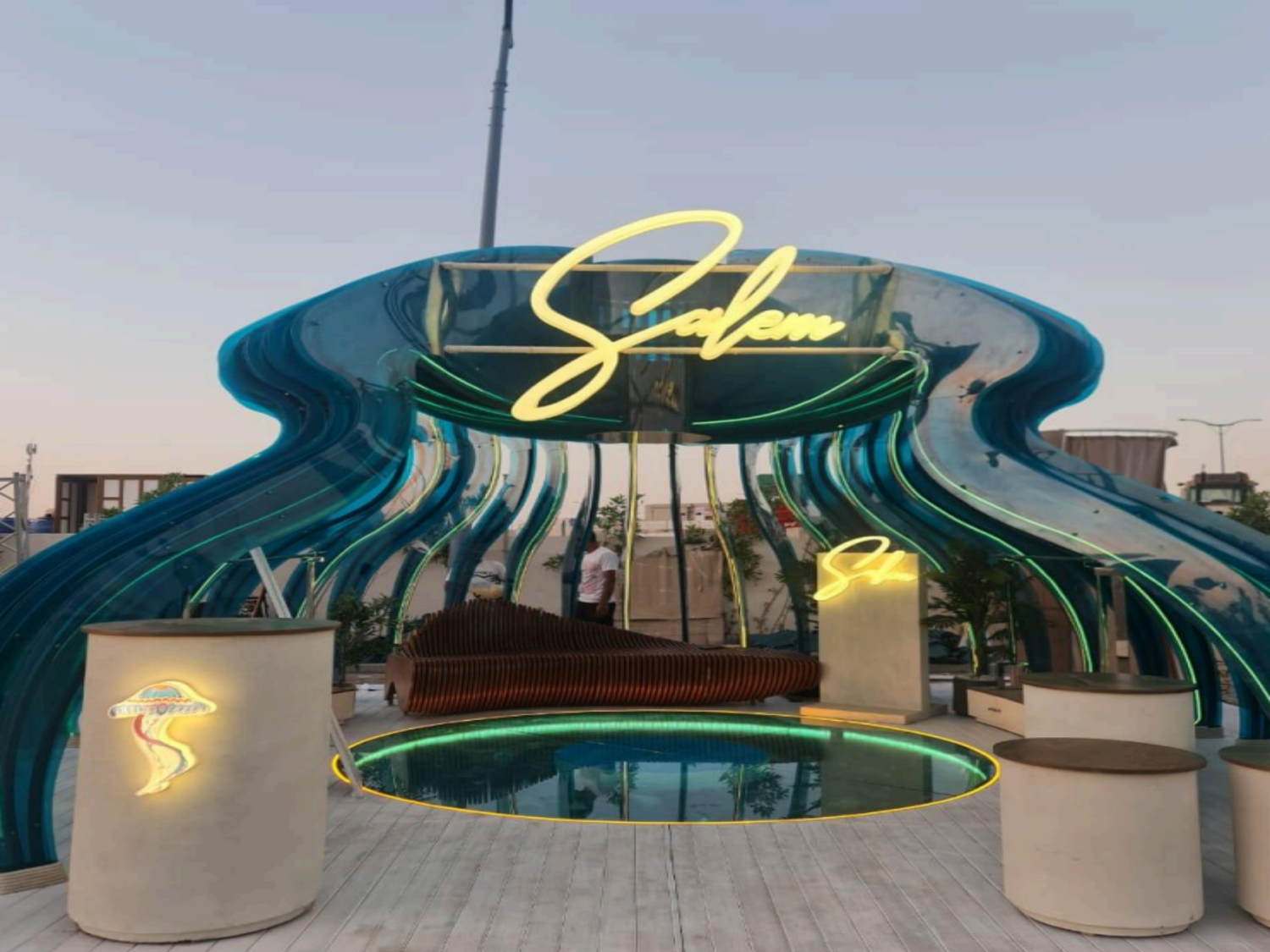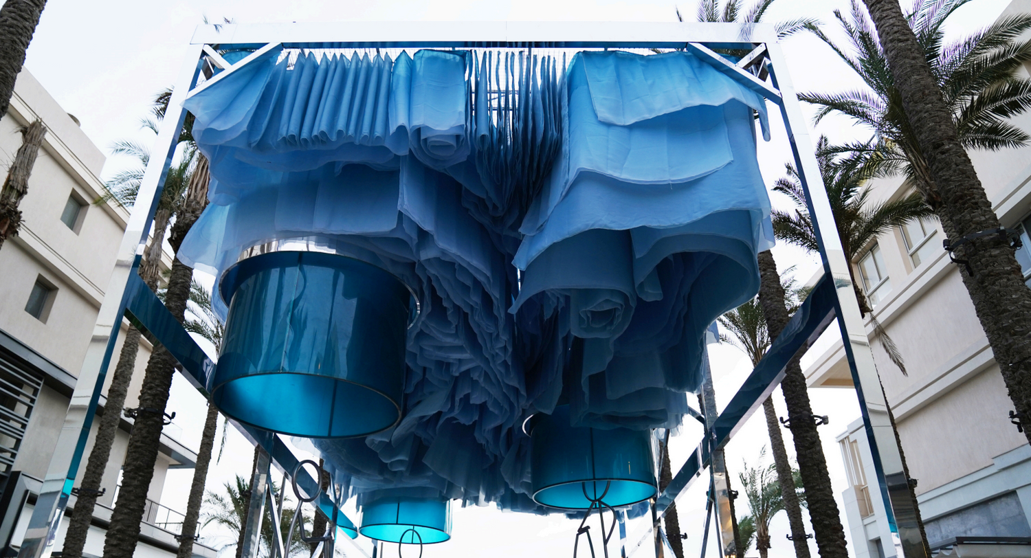 The design features a sleek, oceaninspired structure that serves as the centerpiece of the installation. The wavy, flowing lines of the translucent blue panels are reminiscent of ocean waves, encapsulating the dynamic and fluid nature