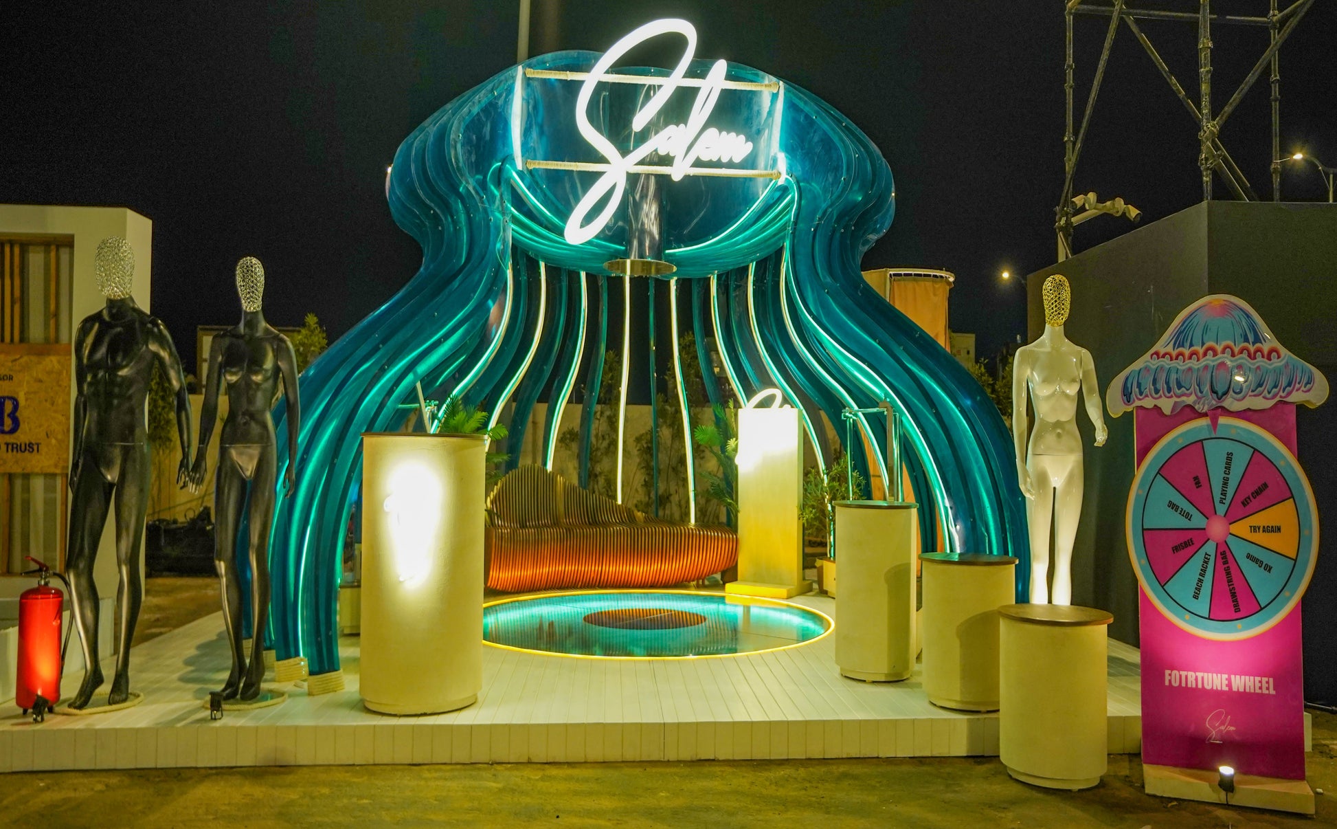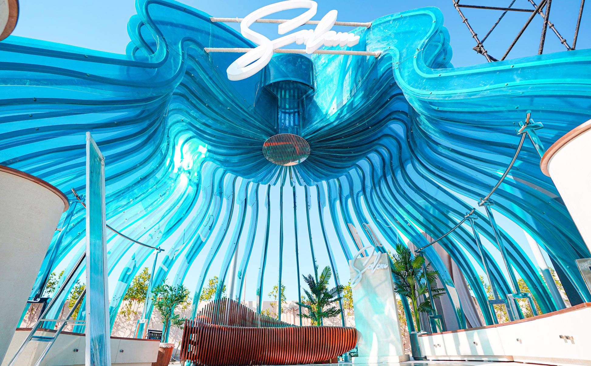 The design showcases a sleek, ocean-inspired structure that stands as the focal point of the installation. Its flowing, wave-like form crafted from translucent blue panels evokes the movement and fluidity of the sea, capturing its dynamic essence.